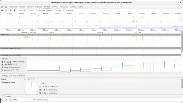 当调用 grow 的时候,它会开始创建 div 节点并且把他们追加到 DOM 上。它将会分配一个大数组并将它追加到一个全局数组中。这将会导致内存的稳定增长,使用上面提到的工具可以观察到这一点。