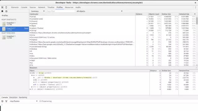 在图中有两个明显的标志表明我们正在泄漏内存。节点的图表(绿色的线)和 JS 堆内存(蓝色的线)。节点数稳定地增长并且从不减少。这是一个明显的警告标志。 JS 堆内存表现出稳定的内存用量增长。由于垃圾回收器的作用,这很难被发现。你能看到一个初始内存的增长的图线,紧接着有一个很大的回落,接着又有一段增长然后出现了一个峰值,接着又是一个回落。这个情况的关键是在于一个事实,即每次内存用量回落时候,堆内存总是比上一次回落后的内存占用量更多。也就是说,尽管垃圾收集器成功地回收了很多的内存,还是有一部分内存周期性的泄露了。 我们现在确定程序中有一个泄露,让我们一起找到它。 拍两张快照为了找到这个内存泄漏,我们将使用 Chrome 开发者工具红的 profiles 选项卡。为了保证内存的使用在一个可控制的范围内,在做这一步之前刷新一下页面。我们将使用 Take Heap Snapshot 功能。 刷新页面,在页面加载结束后为堆内存捕获一个快照。我们将要使用这个快照作为我们的基准。然后再次点击按钮,等几秒,然后再拍一个快照。拍完照后,推荐的做法是在脚本中设置一个断点来停止它的运行,防止更多的内存泄露。 有两个方法来查看两个快照之间的内存分配情况,其中一种方法需要选择 Summary 然后在右面选取在快照1和快照2之间分配的对象,另一种方法,选择 Comparison 而不是 Summary。两种方法下,我们都将会看到一个列表,列表中展示了在两个快照之间分配的对象。 本例中,我们很容易就可以找到内存泄露:它们很明显。看一下(string)构造函数的 Size Delta。58个对象占用了8 MB 内存。这看起来很可疑:新的对象被创建,但是没有被释放导致了8 MB 的内存消耗。 如果我们打开(string)构造函数分配列表,我们会注意到在很多小内存分配中掺杂着的几个大量的内存分配。这些情况立即引起了我们的注意。如果我们选择它们当中的任意一个,我们将会在下面的 retainer 选项卡中得到一些有趣的结果。 我们发现我们选中的内存分配信息是一个数组的一部分。相应地,数组被变量 x 在全局 window 对象内部引用。这给我们指引了一条从我们的大对象到不会被回收的根节点(window)的完整的路径。我们也就找到了潜在的泄漏点以及它在哪里被引用。 到现在为止,一切都很不错。但是我们的例子太简单了:像例子中这样大的内存分配并不是很常见。幸运的是我们的例子中还存在着细小的 DOM 节点内存泄漏。使用上面的内存快照可以很容易地找到这些节点,但是在更大的站点中,事情变得复杂起来。最近,新的 Chrome 的版本中提供了一个附加的工具,这个工具十分适合我们的工作,这就是堆内存分配记录(Record Heap Allocations)功能 通过记录堆内存分配来发现内存泄露取消掉你之前设置的断点让脚本继续运行,然后回到开发者工具的 Profiles 选项卡。现在点击 Record Heap Allocations。当工具运行时候你将注意到图表顶部的蓝色细线。这些代表着内存分配。我们的代码导致每秒钟都有一个大的内存分配发生。让它运行几秒然后让程序停止(不要忘记在此设置断点来防止 Chrome 吃掉过多的内存)。 在这张图中你能看到这个工具的杀手锏:选择时间线中的一片来观察在这段时间片中内存分配发生在什么地方。我们将时间片设置的尽量与蓝色线接近。只有三个构造函数在这个列表中显示出来:一个是与我们的大泄露有关的(string),一个是和 DOM 节点的内存分配相关的,另一个是 Text 构造函数(DOM 节点中的文本构造函数)。 从列表中选择一个 HTMLDivElement 构造函数然后选择一个内存分配堆栈。 啊哈!我们现在知道那些元素在什么地方被分配了(grow -> createSomeNodes)。如果我们集中精神观察图像中的每个蓝色线,还会注意到 HTMLDivElement 的构造函数被调用了很多次。如果我们回到快照 comparison 视图就不难发现这个构造函数分配了很多次内存但是没有从未释放它们。也就是说,它不断地分配内存空间,但却没有允许 GC 回收它们。种种迹象表明这是一个泄露,加上我们确切地知道这些对象被分配到了什么地方(createSomeNodes 函数)。现在应该去研究代码,并修复这个泄漏。 其他有用的特性在堆内存分配结果视图中我们可以使用比 Summary 更好的 Allocation 视图。 这个视图为我们呈现了一个函数的列表,同时也显示了与它们相关的内存分配情况。我们能立即看到 grow 和 createSomeNodes 凸显了出来。当选择 grow 我们看到了与它相关的对象构造函数被调用的情况。我们注意到了(string),HTMLDivElement 和 Text 而现在我们已经知道是对象的构造函数被泄露了。 这些工具的组合对找到泄漏有很大帮助。和它们一起工作。为你的生产环境站点做不同的分析(最好用没有最小化或混淆的代码)。看看你能不能找到那些比正常情况消耗更多内存的对象吧(提示:这些很难被找到)。