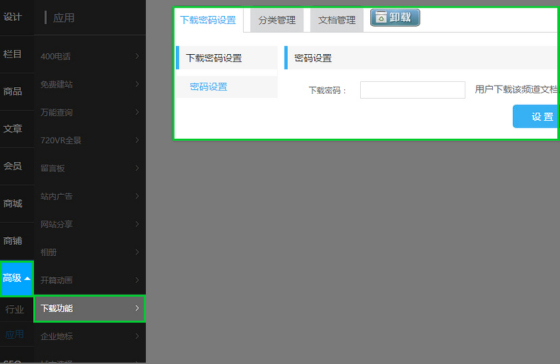 功能说明 设置后,用户可对网站上传的内容进行下载功能目标 管事员上传的文档,可供用户下载功能特点 ■支持文件类型:gif,jpg,jpeg,png,bmp,doc,docx,xls,xlsx,ppt,htm,html,txt,zip,rar,apk,ipa,pdf ■ 单个文件大小不能超过 30M操作说明第一步: 点击 应用——下载功能 设置需要先设置密码,供下载使用。第二步:对需要下载的内容进行分类第三步:上传文档