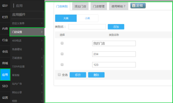 功能说明 微网站门店设置主要功能点: 1、支持二级设置(城市+门店),并可以筛选 2、门店地图导航功能 3、门店信息包括(门店名称,图片,地址,联系方式,地图标注) 4、门店类别支持大类,小类两级操作说明 1、进入门店设置、如图1: 2、设置门店:微门店包括:“门店类别、添加门店、门店设置”。 A、门店类别:设置所属的类别,如图2: B、添加门店:如图3、4 说明:因为门店设置中是不能添加商品的,只是展示门店信息,如果想点击门店名称进入商品,就可以通过外部链接中的“查找链接”添加上网站