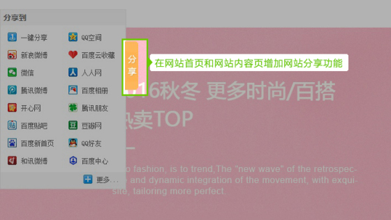 功能说明 用户将网站内容分享到第三方网站,第三方网站的用户点击专有的分享链接,从第三方网站带来社会化流量。使用了百度分享的网页可以更快地被百度爬虫发现,从而帮助网站的内容更快地被百度抓取。功能目标 引入社会化流量 提升网页抓取速度 展示网页分享量场景应用 在网站首页和网站内容页增加网页分享功能 如图:操作说明 第一步:点击“网站分享”,如图: 第二步:设置网站是否开启页面分享功能,如图: 项目说明:1、不显示分享:即关闭掉网站页面的分享功能2、显示默认浮动分享:即在首页显示系统提