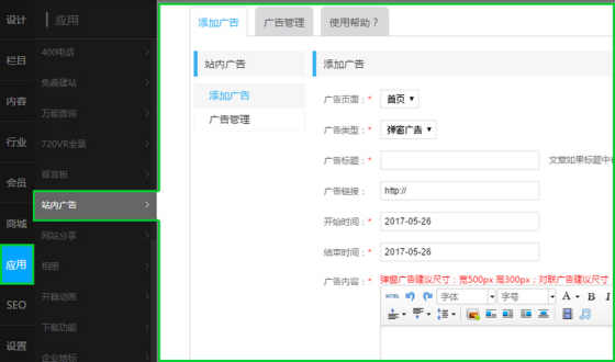 功能说明 客户可以在自己的网站上发布弹出广告、漂浮广告、对联广告三种网站广告形式展示。功能目标 增加客户在网站上进行营销广告的位置和投放形式。功能特点 支持广告显示时间段设置,开始时间、结束时间。场景应用 企业进行网络营销中,可以在网站上自己投放相应的广告进行客户告之。操作说明 第一步:点击“站内广告”,如图: 第二步:添加和管理站内广告 添加站内广告如图: 项目说明: 广告页面:即广告显示在网站哪个页面上 广告类型:弹出广告、漂浮广告、对联广告类型可供您选择 弹出广告: