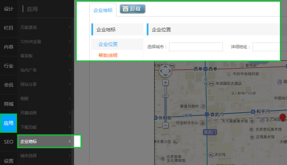 功能说明 基于在线地图功能,实现在地图上标注您的公司位置,便于您的网站访客找到您的公司实际所在地。常见问题 在添加详细地址时,输入详细的街道门牌号,不要输入写字楼名称。功能目标: 帮助您的网站访客可以在在线地图上找到您的公司实际所在地。功能特点: 客户可以在此功能上,查询公司所在位置周边的配套设置,如酒店,公交线路等。操作说明 第一步:点击 应用——企业地标如图: 第二步:完成企业地标基础配置 项目说明: 选择城市:输入您公司所在的的具体城市,如 北京 详细地址:输入您公司所在的具体