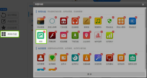 功能说明 炫酷的图片展示效果,满足对图片较多的客户,展示效果的多样化需求。功能目标 多样化的图片展示效果。功能特点 支持多种展示效果选择场景应用 如果较多,使用图片栏目进行展示认为确实动态效果,可以使用相册功能来更好的展示。操作说明 第一步:进入电脑建站—》高级功能à点击“相册”组件 如图: 第二步:完成相册基础设置 项目说明: 相册名称:设置相册的名称 封面:设置相册封面图片 相册风格:从已有的8种相册展示风格中选择 第三步:添加相片 项目说明: 所属相册:选择要上传相片
