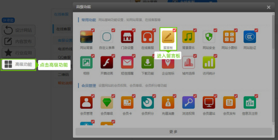 功能说明 访客可以在留言板栏目中进行留言,网站管理员可以在后台查看访客留言并回复访客的留言.常见问题: 1、留言板栏目为系统栏目,仅支持设置是否显示和不显示,不支持栏目删除.功能目标 解决网站客服不在线时,访客可以在留言板进行留言咨询,使网站不错过商机.功能特点 支持是否允许非会员留言设置 支持是否显示客户留言设置 支持是否显示管理员回复设置场景应用 当您的网站客服不在线时,访客可以在留言板栏目进行留言咨询相关产品或服务问题.操作说明 第一步:进入电脑建站—》高级功能à点击“留言