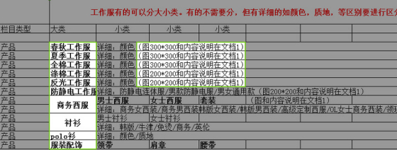 操作步骤总体步骤① 线下:规划产品内容——整理产品详细——制作产品图片② 线上:根据规划设置栏目——根据规划进行产品分类——进行发布第一步:整理自己的产品信息,进行分类,划分(如图以工作服为例的整理)分类后制作相关图片第二步① 根据线下规划内容设置 产品栏目,进行大类,小类划分。② 产品参数设置,数据统一如:编号、图片大小等。产品名称:一般为4个汉字——8个汉字以内产品品牌:添加品牌,后台便用调用。特殊状态:促销、新品、或特价标识选择。价格:以阿拉伯数字为主。并留小数点后两位如:100.00图片:按提示进行