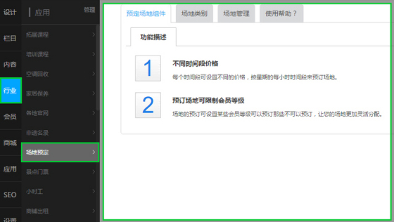 功能说明  场地预定功能可以让用户便捷的查询到运动场馆的位置、联系电话、场馆设施、真实照片以及不同时间段的价格等信息,方便用户预约自己所需要的时间和场地并下单进行预约支付。功能目标A、 增加网站来访客户对您网站、对您公司的认可度,让来访客户在浏览您众多同行的网站过程中记住您,增加您的销售机会。B、 通过销售人员时间的方式,获得企业业绩增长或业务增值C、 专业化的人员展示,必将增加网站来访客户的信息认可度功能特点  A、 实现了人员的分类定义和每一类别人员属性自定义功能,这样可以实现同一个公司团队员,可以