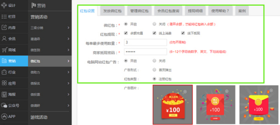 功能说明 1、 注册送红包:新会员注册账号即赠送红包。 2、红包活动:领取红包后即可消费。常见问题: 1、红包领取后有使用期限请在期限内使用 2、已过期的红包是不能再次使用的。 3、活动关闭后,即不可在导航中显示。 4、注册送红包在的活动时间不可重复或重叠。功能目标 宣传速度快,吸粉功效强。功能特点 1、活动红包可指定每人每天可领取的个数和总共可领取的个数。 2、会员领取红包分为固定金额和随机金额。 3、可自由设置红包预算。场景应用 线上、线下搞活动发红包,专注吸引用户。操作说