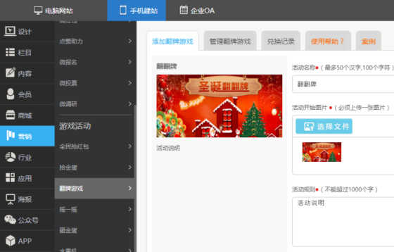 功能说明 手机网站的营销活动功能,可进行抽奖参与活动功能目标 微网站推广的一种方式,可进行抽奖活动,达到推广网上或者产品的目的功能特点 快捷,方便,简单,直观的将产品直达推广。场景应用 手机网站操作说明 第一步:点手机网站后台——营销推广——圣诞翻牌 第二步:添加圣诞游戏根据提示添加需要的内容,包括时间,图片上传,规则说明等内容。 第三步:管理游戏 管理查看游戏设置的内容,可用二维码扫描查看具体内容,如有问题可修改。分享设置:当用户打开该活动时可以进行分享,分享到微信或者微博等相