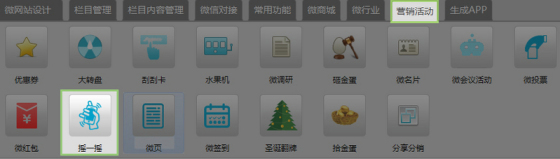 功能说明 与微信对接,进行摇一摇活动,可进行红包或者奖品活动设置功能目标 微网站的一种营销推广的一种方式,可进行红包或奖品活动,达到推广网上或者产品的目的功能特点 快捷,方便,简单,直观的将产品直达推广。场景应用 手机网站操作说明 (注:摇一摇功能只支持微信浏览并参与活动!) 第一步:进入手机建站“营销活动”点击“摇一摇”组件如图: 第二步:管理员发布红包活动 第三步:管理摇一摇活动,设置转发信息。 1、对摇一摇活动进行管理。 2、分享设置(微信对接认证订阅号和认证服务号生效