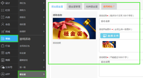 功能说明 商家可以通过是砸金蛋活动,吸引更多的客户参加,提升网站人气,提高网站受众群。操作说明 第一步:进入手机建站后台——营销——游戏活动——点击“砸金蛋”组件 如下图: 第二步:添加砸金蛋 1)、填写活动名称、活动说明、活动时间,上传开始图片等活动信息。 2)、填写中奖公告:上传中奖公告图片,尺寸为:640*320像素。填写具体的中奖内容说明,字数在1000字之内。 3)、填写活动结束信息:上传活动结束图片,填写活动结束通知内容。 4)、填写高级设置:填写奖品数量,设置预计参加摇奖人数和参与次