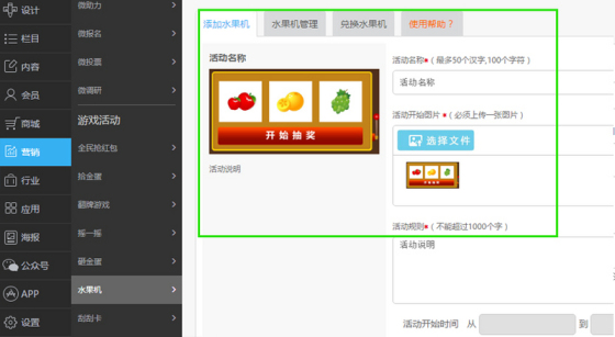 功能说明 商家可以通过是水果机活动,吸引更多的客户参加,提升网站人气,提高网站受众群。操作说明 第一步:进入手机建站后台à营销活动à点击“水果机”组件 如下图: 第二步:添加水果机 1)填写活动名称、活动说明、活动时间,上传开始图片等活动信息。 2)填写中奖公告:上传中奖公告图片,尺寸为:640*320像素。填写具体的中奖内容说明,字数在1000字之内。 3)填写活动结束信息:上传活动结束图片,填写活动结束通知内容。 4)填写高级设置:填写奖品数量,设置预计参加摇奖人数和参与次数、兑奖密码等信