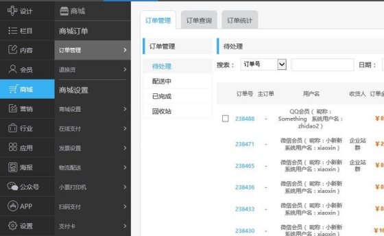 功能说明 订单管理功能是为了处理订单,让后台的管理者方便的来管理商品的订单,把订单聚在一起进行统一管理,让会员用户方便查看处理自己的订单。使商家和买家通过这个功能来实时了解订单的状态。功能目标 1、管理者方便管理查看订单 2、会员方便查看操作自己的订单,来进行和商家沟通交流。功能特点 方便快捷,实时高效的来对订单进行处理。场景应用 网站购物。操作说明 1、点击微商城,订单管理。如图手机端入口--微商城--订单管理 2、管理员订单管理 订单管理中包含未处理订单、配送中的订单、已完成的订单