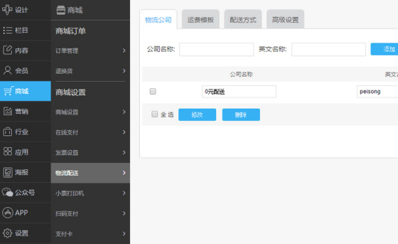 功能说明 用户在购买商品需要邮寄时,可根据自己情况来选择配送商提供的物流配送方式,使用户有多个选择配送商品方式。功能目标 让用户购买商品时候配送方式多样选择化。功能特点 用户在购买商品时候可有多个配送方式可选择场景应用 商品支付操作说明 第一步:点击手机端的后台微商城---物流配送 设置入口。如图手机端入口--微商城--物流配送 第二步:物流配送设置 1、门店配送:管理员可选择是否开启门店配送,开启则用户购买时可选择,若关闭用户不能使用。如图 开启门店配送的前台显示 如图 2、添加删除物流