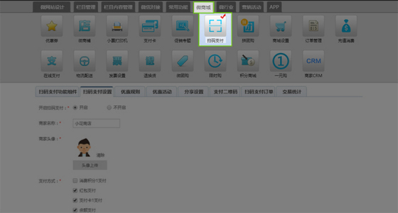 功能说明1、设置微商铺可扫码支付2、设置会员扫码支付优惠活动功能目标在多用户商铺当中,可以让会员通过扫码向商家付款。场景应用主要用于多用户商城网站中,有需要扫码支付需求的商家。操作说明第一步:“扫码支付”手机版入口登陆网站后,点击手机建站—》微商城—》扫码支付,如图:第二步:设置开启商城扫码支付功能该功能在扫码设置当中,选择开启设置填写商家名称、支付方式、赠送内容、支付界面样式设置等操作。如图第三步:设置优惠规则添加优惠规则:可设置添加扫码支付的优惠活动规则说明,如图:管理优惠规则:添加好的优惠规
