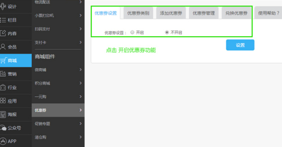 功能说明客户线上领取优惠券,线下实体店消费使用,优惠券是网站与实体店,线上与线下相结合的渠道.操作说明 第一步:进入手机建站后台——商城——商城组件——点击“优惠券”组件 如下图: 第二步:功能介绍 1、类别设置—设置大类和小类 1)、添加大类:选择大类,添加类别名称,点击添加。如果需要在大类中添加外链,可以在列表中输入外链地址,设置好类别页面的打开方式和显示顺序后,勾选点击修改按钮进行保存或者删除大类。 2)、添加小类:选择小类和该小类所需要添加的大类,填写小类名称点击添加。添加后,