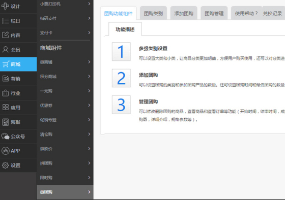 功能说明 团购是一个将消费者与企业或商家紧密结合结合的一个功能,它可以让商家薄利多销获得更多的利润与销售金额。吸引更多的用户来参与团购活动中。常见问题 问:购买后,对功能不满意是否支持退款? 答:支持,购买后7天内无条件退款 问:我不会使用团购功能怎么办? 答:可以咨询客服协助您完成,帮您解决使用中的问题。功能目标 吸引更多人来参与网站的团购中来,增加网站人流量,卖出更多的商品。 薄利多销带来更大的利润。功能特点 团购可以为用户会员带来以下好处: 1、省钱:凭借网络,将有相同购买意