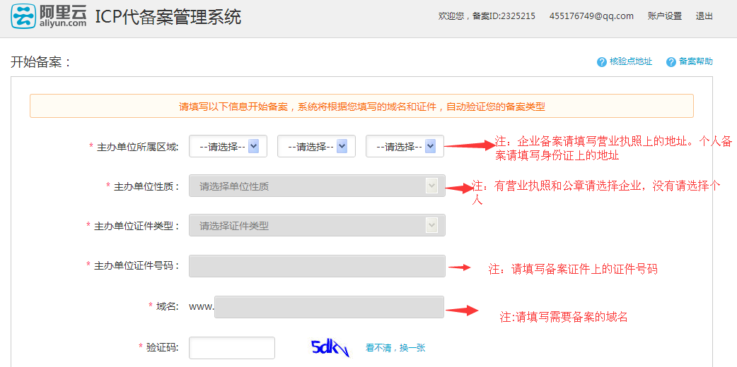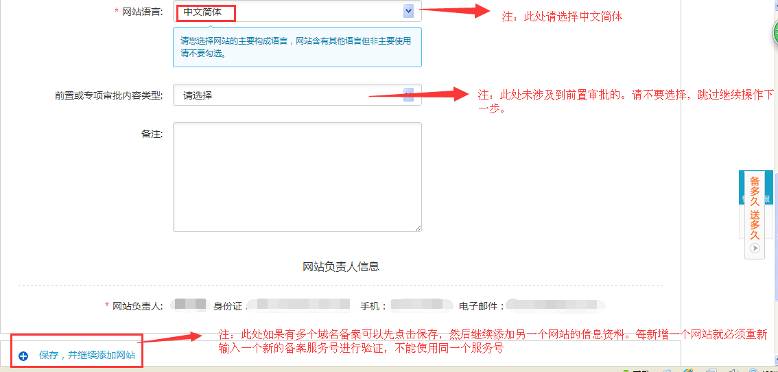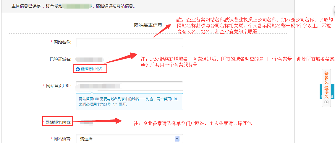 验证通过后继续填写备案具体信息,如图所示: