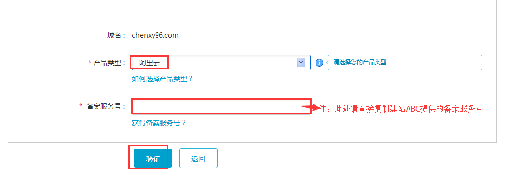 选择产品类型后,接下来就需要输入备案服务后号,此服务号就是MY249给您提供的服务号,请直接加MY249客服QQ:2058793689 获取备案服务号,取得服务号后直接复制上去就可以,复制后点击验证就可以进行下一步操作。页面如图所示: