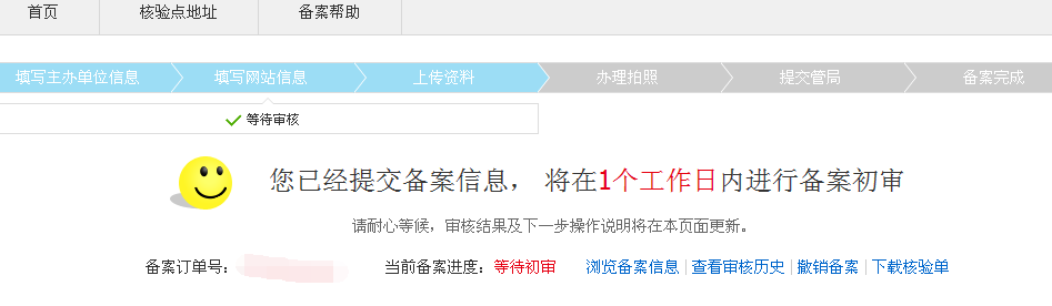 第五步:阿里云公司收到您提交的所有资料,整理后会提交当地通信管理局进行备案审核,备案审核一般会在20个工作日之内完成,具体时间不知,备案结果通信管理局会以短信和邮件的形式通知您,您也可以随时登入阿里云的备案系统查看备案状态。如图所示: