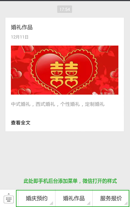 打开微信公众号,即可看见添加的相关主菜单内容